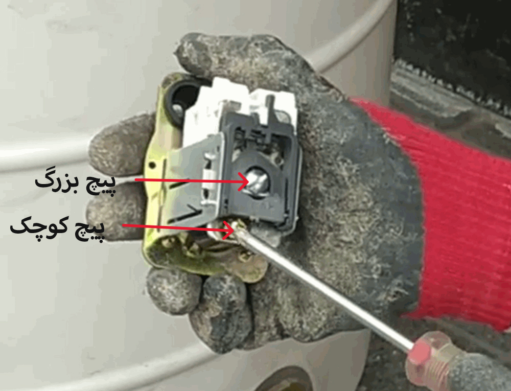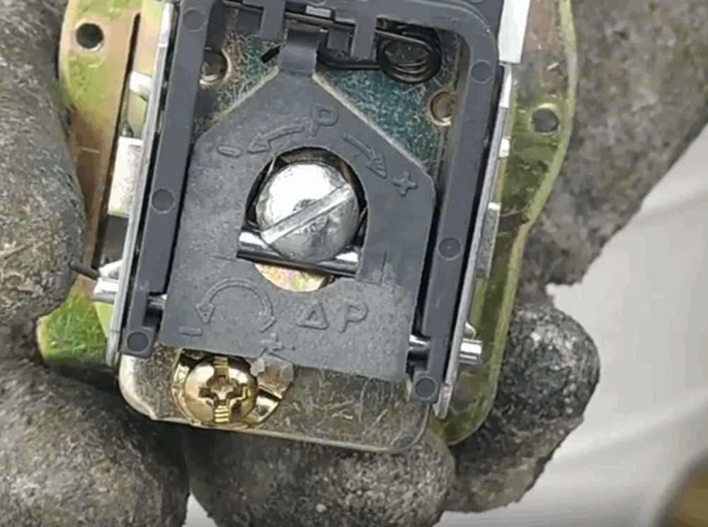 حالا درپوش کلید اتومات را باز کنید. با باز کردن درپوش دو عدد پیچ (یک پیچ بزرگ و یک پیچ کوچک) را مشاهده میکنید. البته در بعضی از کلیدها به جای این دو پیچ، دو عدد مهره استفاده شده است. هرکدام از این دو پیچ، در قسمتِ زیرین خود به فنرهایی متصل هستند. پیچ بزرگتر و فنرِ بزرگتر برای تنظیم فشار استارت یا همان روشن شدنِ پمپ و پیچ کوچک و فنر کوچکتر برای بازه روشن و خاموش شدن پمپ است.