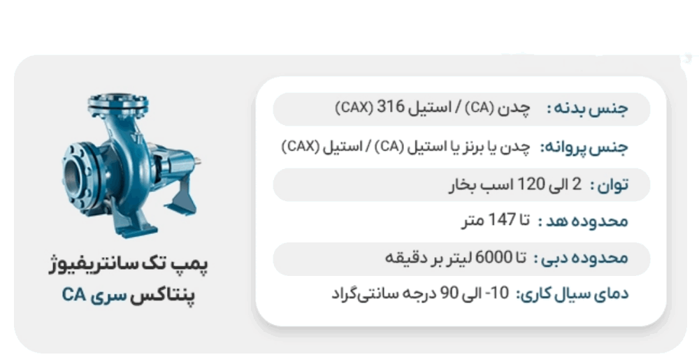 پمپ سانتریفیوژ افقی CA/CAT با رعایت استانداردهای جهانی EN 733 تولید شده است. این سری از پمپهای پنتاکس از نوع پمپ تک هستند که نیاز به اتصال به یک الکتروموتور دارند. این پمپها برای مصارف کشاورزی و سیستمهای آتشنشانی بسیار مناسب هستند. جنس پروانه پمپ سری CA/CAT از چدن ضدزنگ، برنز و استیل است. اما پمپ پنتاکس با سری CAX از جنس استیل ساخته شده است. بدنه پمپ پنتاکس با سری CA/CAT از جنس چدن ضدِزنگ است در صورتی که بدنه پمپ پنتاکس با سری CAX از جنس استیل 316 است.