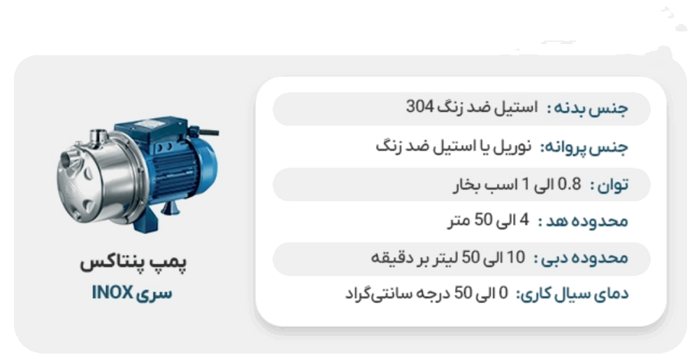 پمپ آب برندِ پنتاکس سری INOX یک پمپ سانتریفیوژی است که برای تامین آب در سیستمهای خانگی کوچک و متوسط، همچنین برای استفاده در مصارف صنعتی با عملکرد متوسط مناسب است. پروانه پمپ از جنس پلاستیک مهندسی (نوریل) تهیه شده است و در برخی موارد از جنس استیل 304 است. بدنه پمپ از فولاد ضدِزنگ ساخته شده است که میتوان از این پمپ برای مصارف باغبانی و مزارع کشاورزی بهره برد.