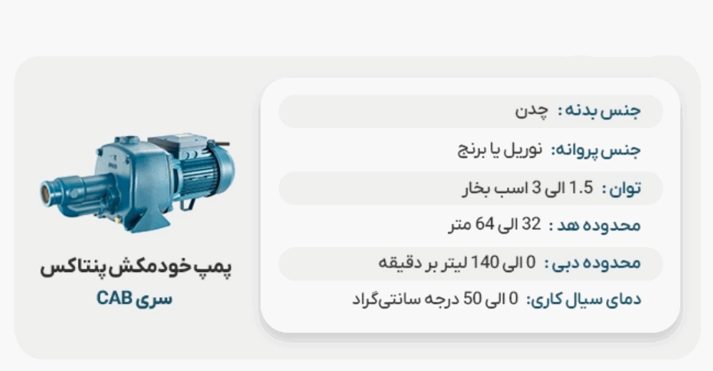 پمپ سانتریفیوژ پنتاکس سری CAB برای تامین آب در سیستمهای خانگی کوچک و متوسط و همچنین برای استفاده در مصارف صنعتی با کاربردهای ساده مناسب است. این پمپ، علاوه بر امکان پمپاژ مایعات، دارای قابلیت خودمکشی و پمپاژ مایعات همراه با گاز است.