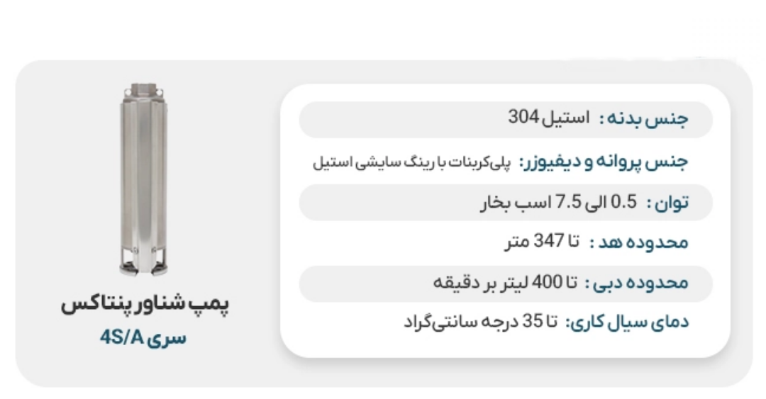 پمپ شناور پنتاکس از سری 4S/A، یک نوع سانتریفیوژ طبقاتی مستغرق در آب است که برای چاههای 4 اینچ مناسب است. جنس بدنه این پمپ از استیل و جنس پروانه و دیفیوزر از پلیکربنات با رینگ سایشی استیل ساخته شدهاند. موتور این سری از پمپ شناور پنتاکس، با استاندارد NEMA طراحی شده و کاربرد اصلی آن در حوزه کشاورزی و عمرانی است.