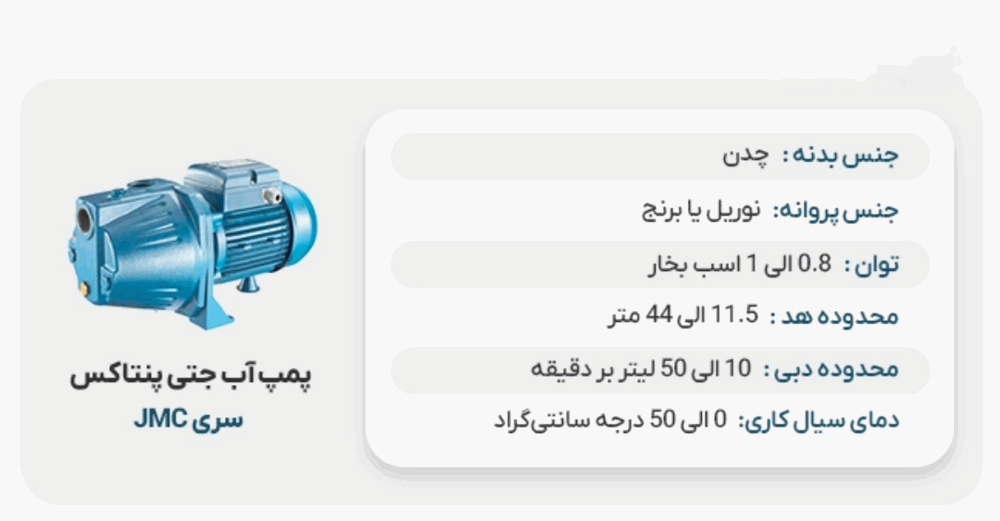 پمپ آب جتی پنتاکس از سری JMC، یک نوع سانتریفیوژ خودمکش است که برای تامین آب و انتقال آب ذخیرهشده در یک استخر یا مخزن بهکار میرود. این پمپ همچنین برای کاربردهای آبیاری باغبانی مورد استفاده قرار میگیرد.