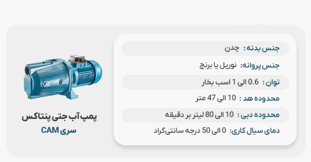 یکی از پمپهای معروف برند پنتاکس، پمپ آب جتی سری CAM است که بازار خوبی دارد. این سری پمپ جتی با توانهای 0.6 الی 1 اسب بخار تولید میشود و علاوه بر استفادههای خانگی، در آبیاری زمینهای کشاورزی و باغات کوچک و تخلیه آب از مخازن و استخرهای کوچک نیز استفاده میشود.