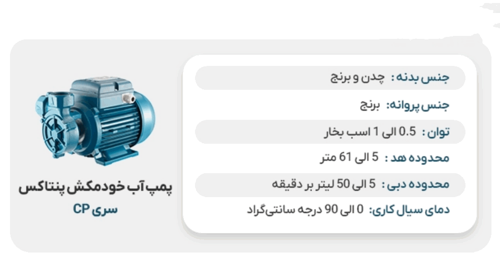 پمپ آب پنتاکس از سری CP، از نوع پمپهای جابهجایی مثبت محیطی است که برای سیستمهای کوچک خانگی و کاربردهای صنعتی ساده استفاده میشود. پوشش جلوی پمپ از برنج ساخته شده است که از مسدود شدن پمپ جلوگیری میکند، و جنس پروانه پمپ از برنج، همچنین سایر قسمتهای بدنه پمپ از چدن ضدِزنگ تهیه شدهاند.