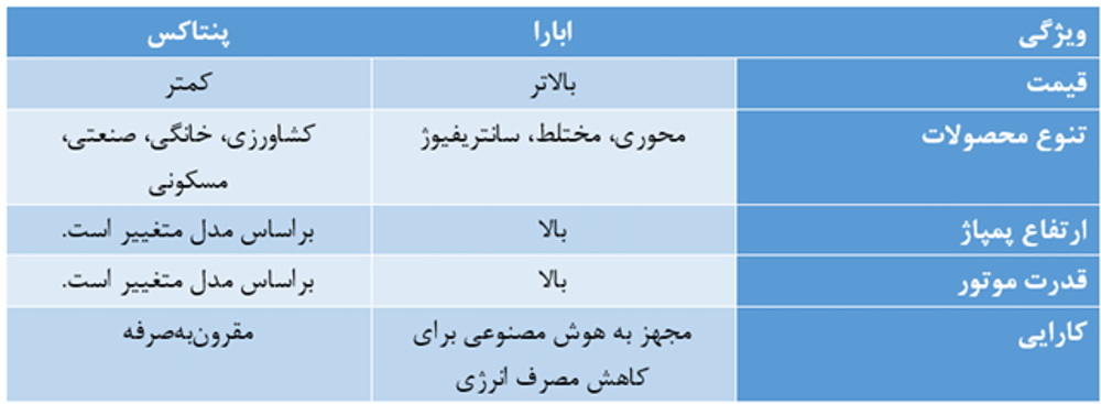جدول مقایسه پمپ آب اِبارا و پنتاکس