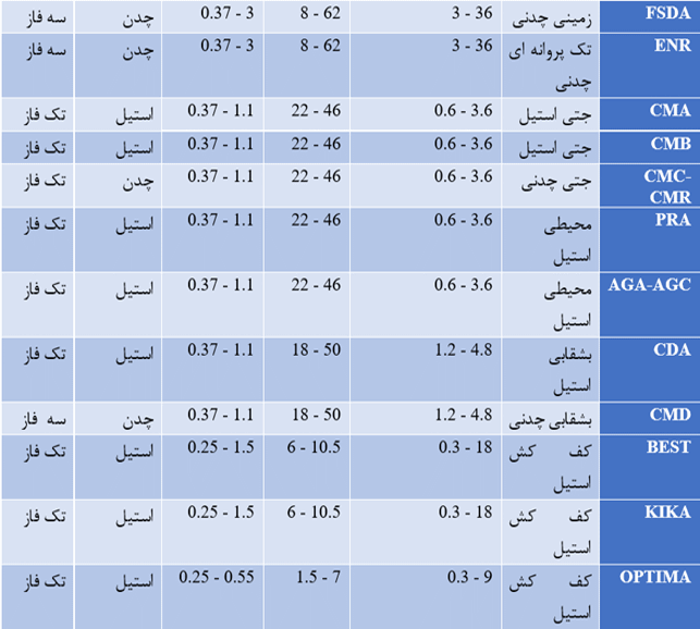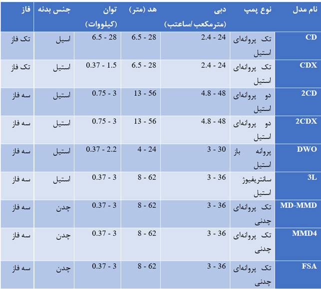 در جدول زیر برخی از مدلهای پمپ آب سه اسب ابارا را معرفی کردهایم: این جدول شامل نام مدل، نوع پمپ، دبی، هد، توان، جنس بدنه و فاز است.